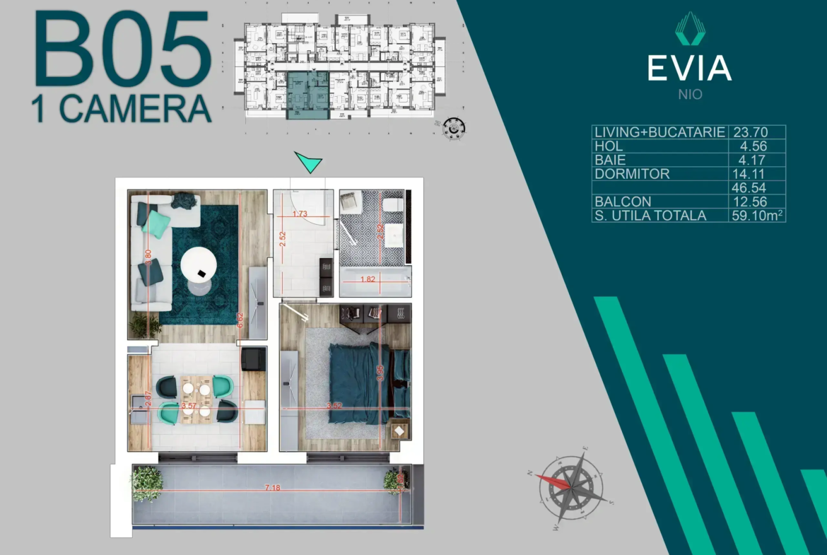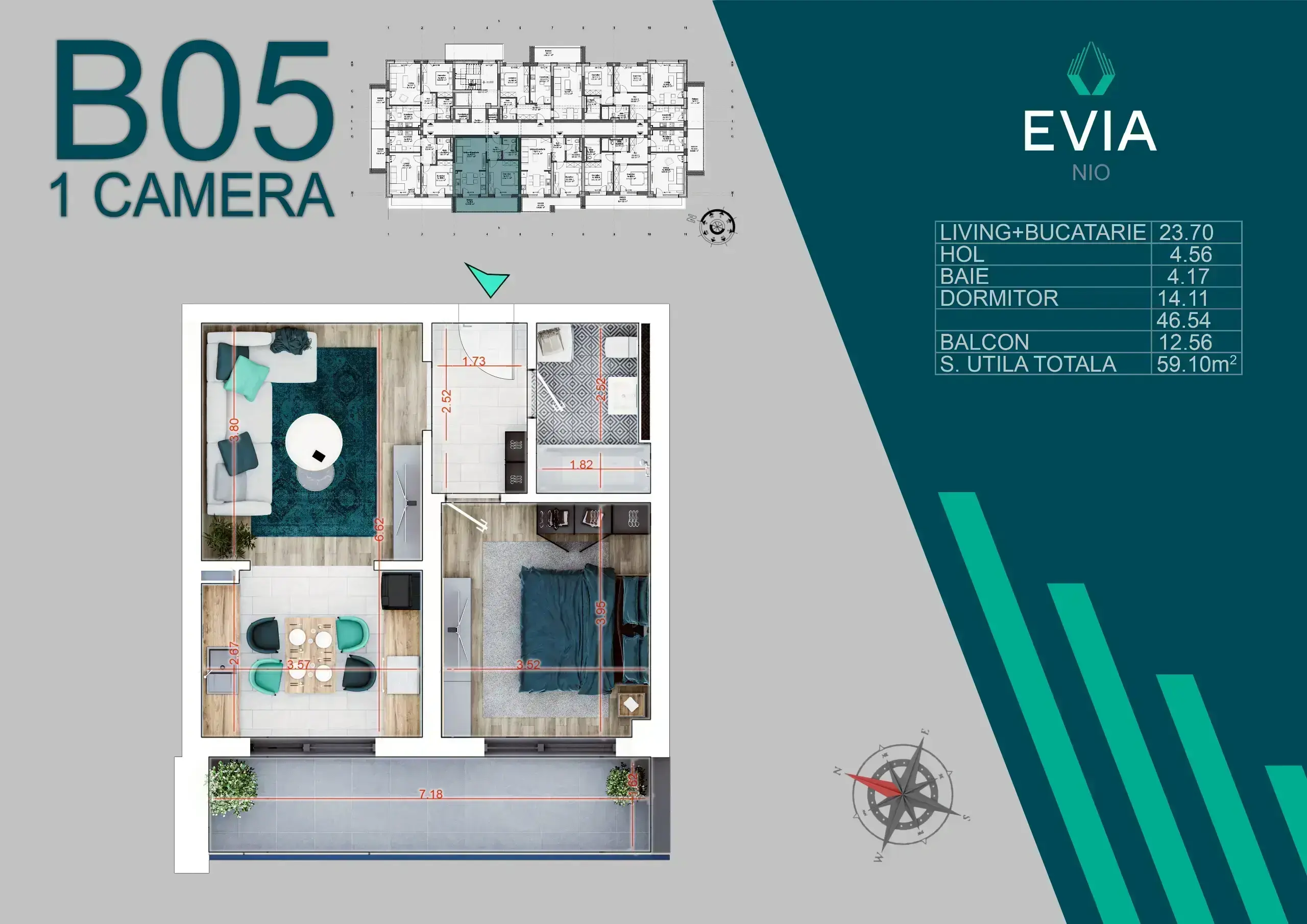 Cu o suprafață totală de 59 mp., apartamentul oferă un living luminos cu bucătărie open space, un dormitor confortabil, o baie complet utilată, un hol spațios și un balcon ideal pentru momente de relaxare. Locuința este complet finisată și dotată cu centrala termică proprie, încălzire prin pardoseală, tamplărie PVC cu geam tripan, ușă metalică și obiecte sanitare moderne.