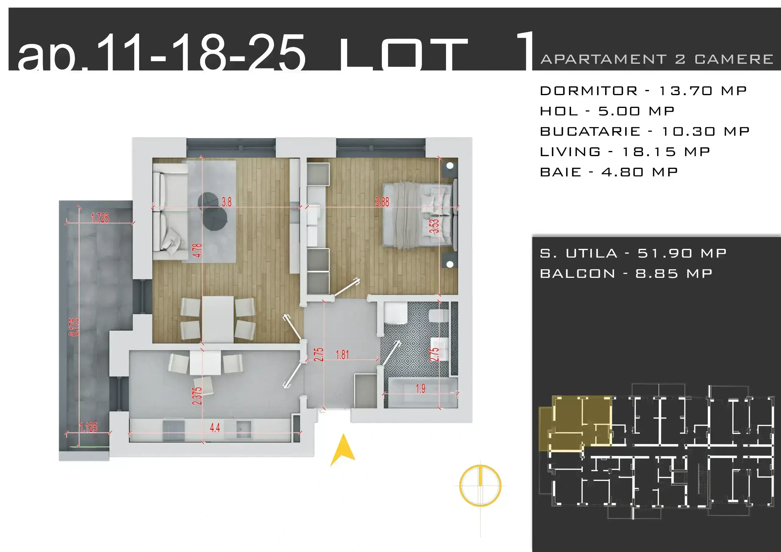 Cu o suprafață utilă generoasă de 60,76 mp, din care 8,85 mp de balcon, ai spațiu pentru dimineți lente cu cafeaua în mână, seri liniștite după o zi plină și momente de relaxare în aer liber, chiar la tine acasă