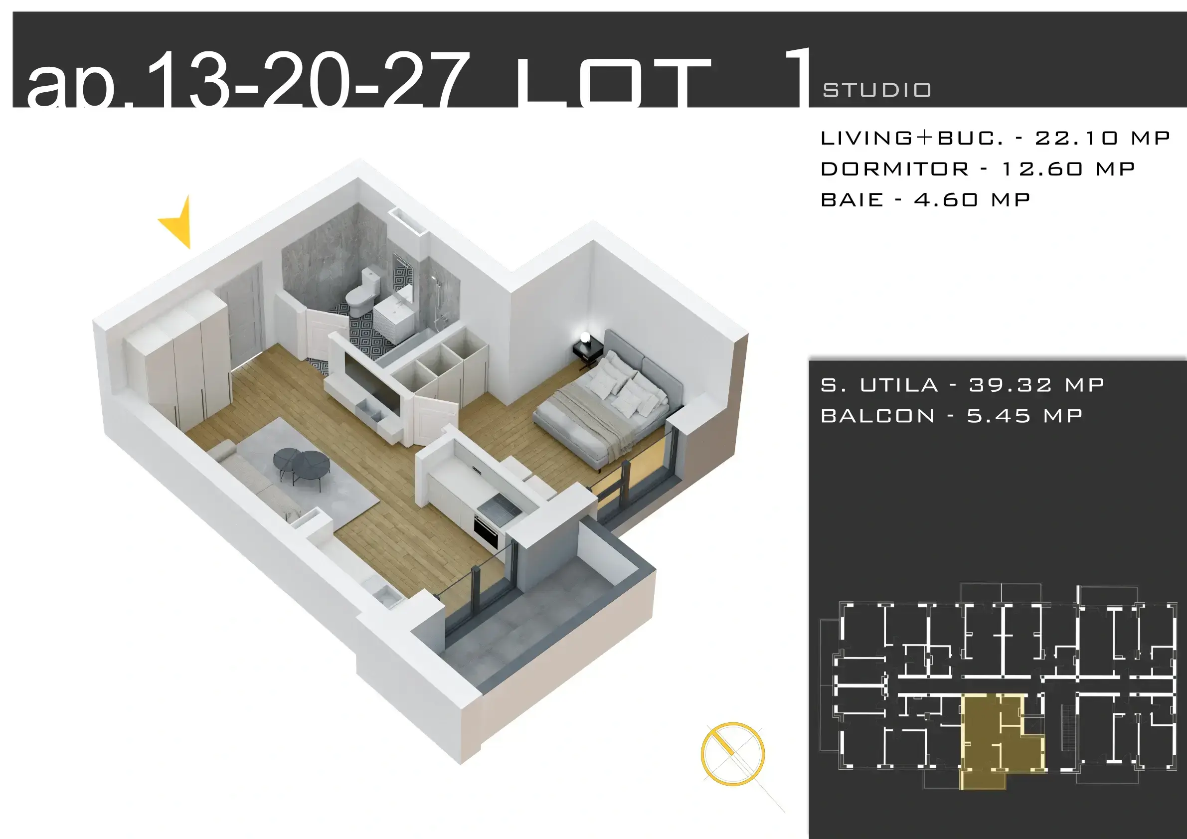 Suprafața utilă este de 39.32 mp , peste care se adaugă un mic balcon de 5.45 mp .