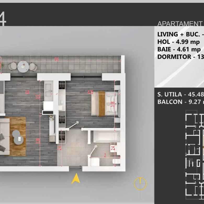 Locuința este un apartament cu 2 camere, cu bucătărie open-space, dispunând totodată de un nivel superior al finisajelor și al materialelor utilizate. Apartamentul are o suprafață utilă de 45,48 mp, la care se adaugă un balcon de 9,33 mp, rezultând o suprafață totală de 54,81 mp. Spațiul este eficient compartimentat, oferind un stil de viață confortabil și practic. Apartamentul este amplasat la parterul unui bloc cu regim de înălțime P+3.