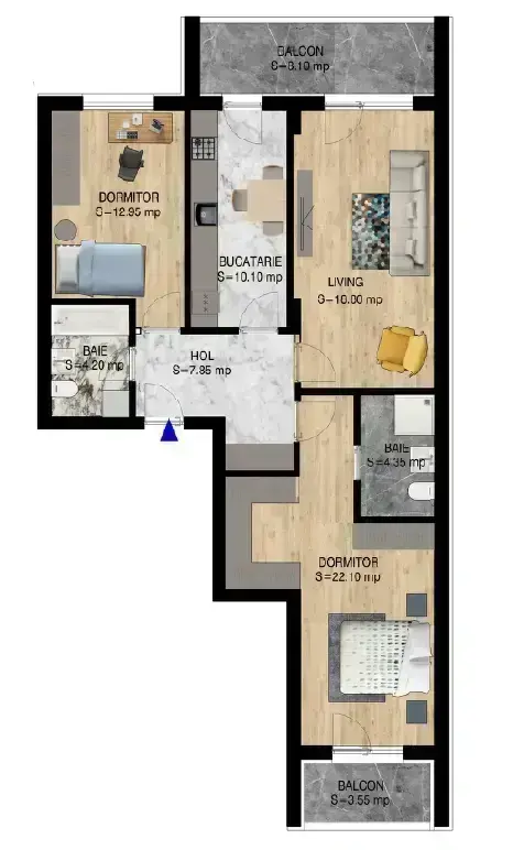 Compartimentare practică, cu dormitor matrimonial ce dispune de baie proprie și dressing. Finisaje la alegere, pentru a-ți crea locuința exact așa cum îți dorești.