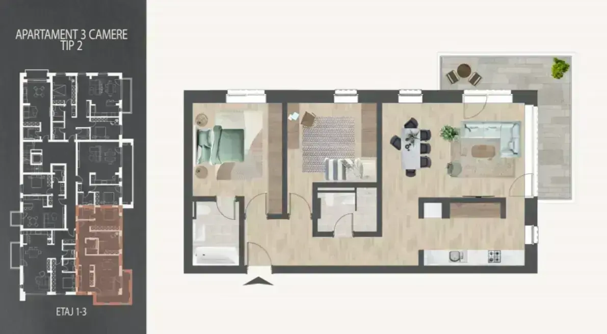 Un apartament gândit pentru viața de familie: camere luminoase, spațiu generos și un balcon unde poți savura cafeaua dimineața, în timp ce copiii se joacă în siguranță.