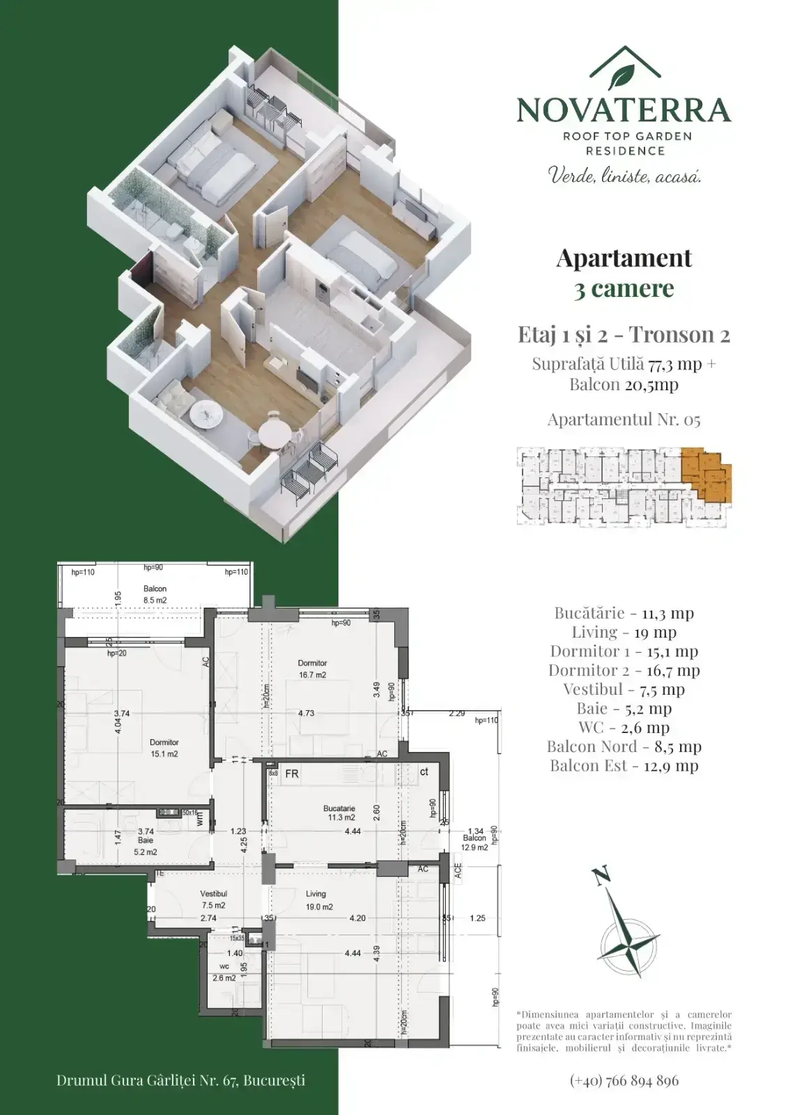Se ofera spre vanzare apartament cu 3 camere, situat in complexul rezidential Novaterra, ansamblu nou, cu standarde moderne de constructie si facilitati corespunzatoare.