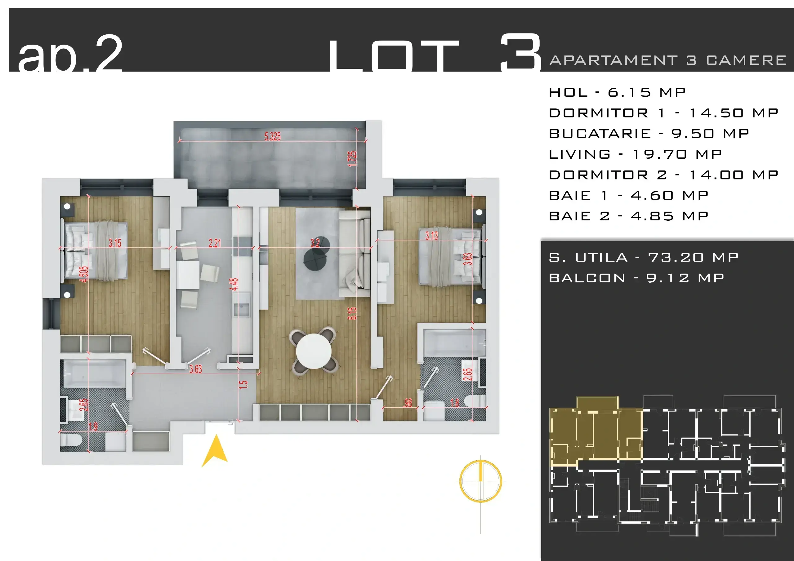 Apartament cu 3 camere decomandat, situat la parter din 3, într-un imobil D+P+3 aflat în cadrul unui complex rezidențial nou. Locuința beneficiază de toate utilitățile racordate și are termen de finalizare în decembrie 2026.