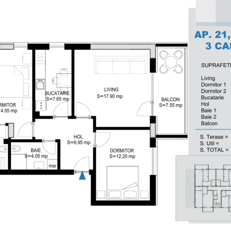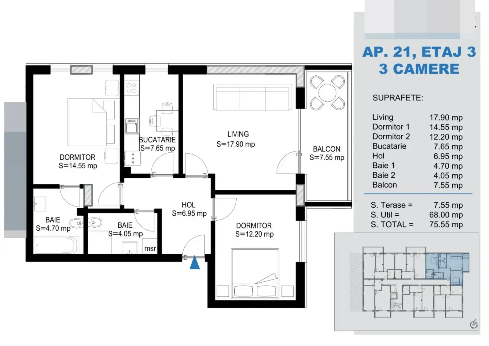 Locuința are o suprafață utilă de 68 mp, la care se adaugă un balcon de 7,35 mp, perfect pentru relaxare.
