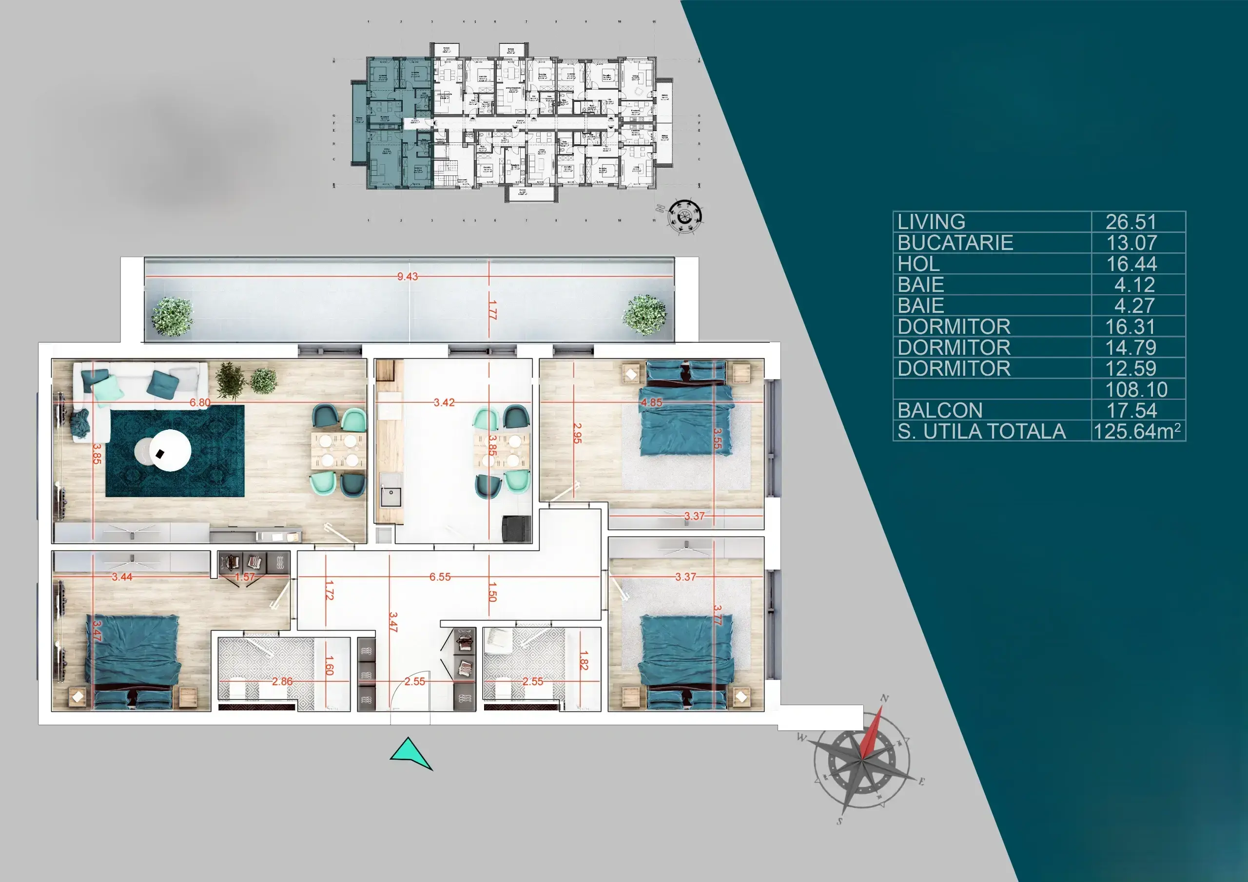Apartament de 4 camere decomandat cu o suprafata utila totala de 125.7 mp, cu iesire pe o terasa generoasa de 17.5 mp, ce ofera o compartimentare inteligenta, cat si o priveliste libera de la balcon.