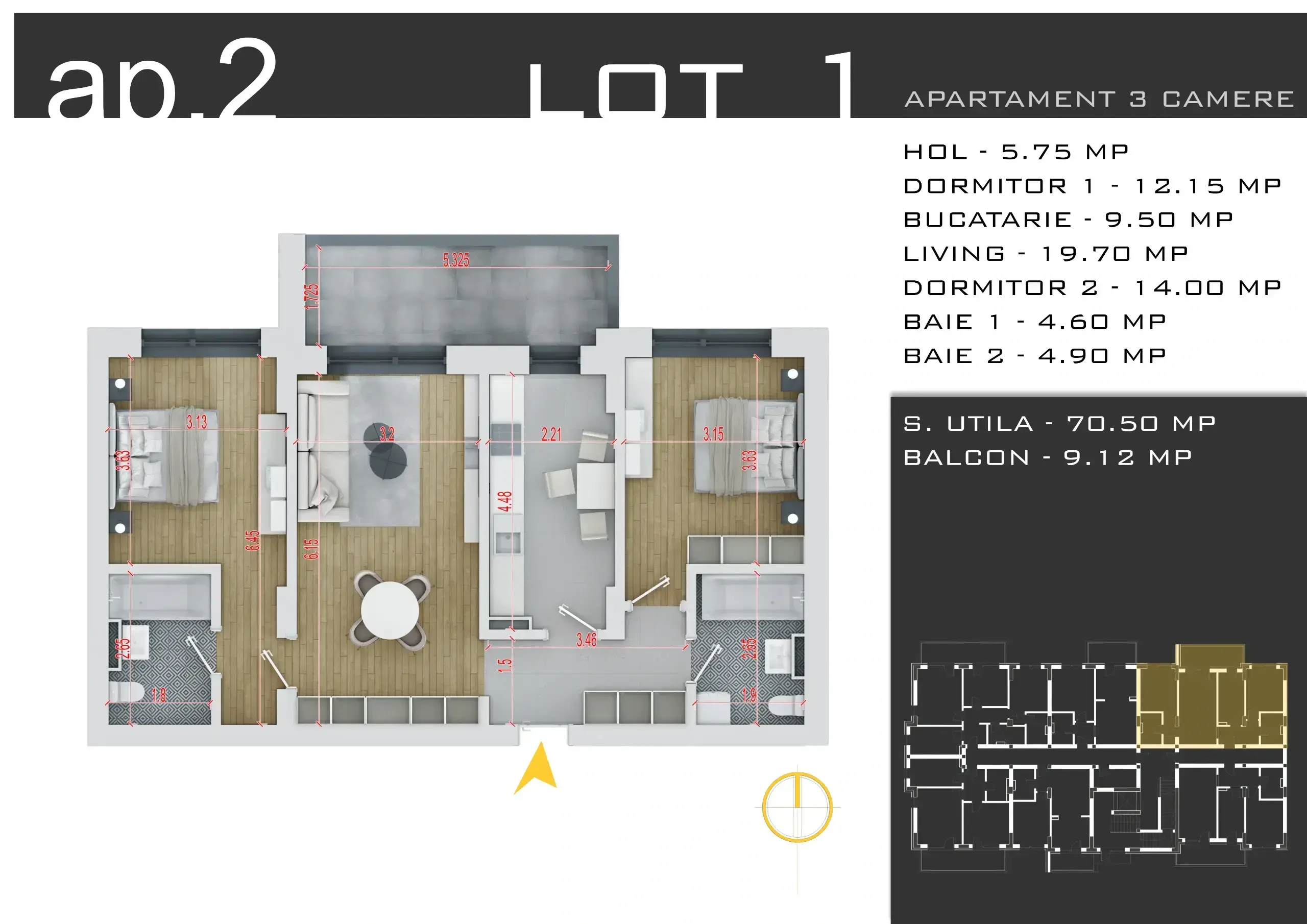 Apartament cu 3 camere decomandat, situat într-un ansamblu rezidențial nou, disponibil direct de la dezvoltator – cu 0 % comision. Locuința oferă o suprafață utilă de 70.46 mp și o suprafață totală de 79.58 mp, fiind ideală pentru cei care își doresc un spațiu generos și bine compartimentat.