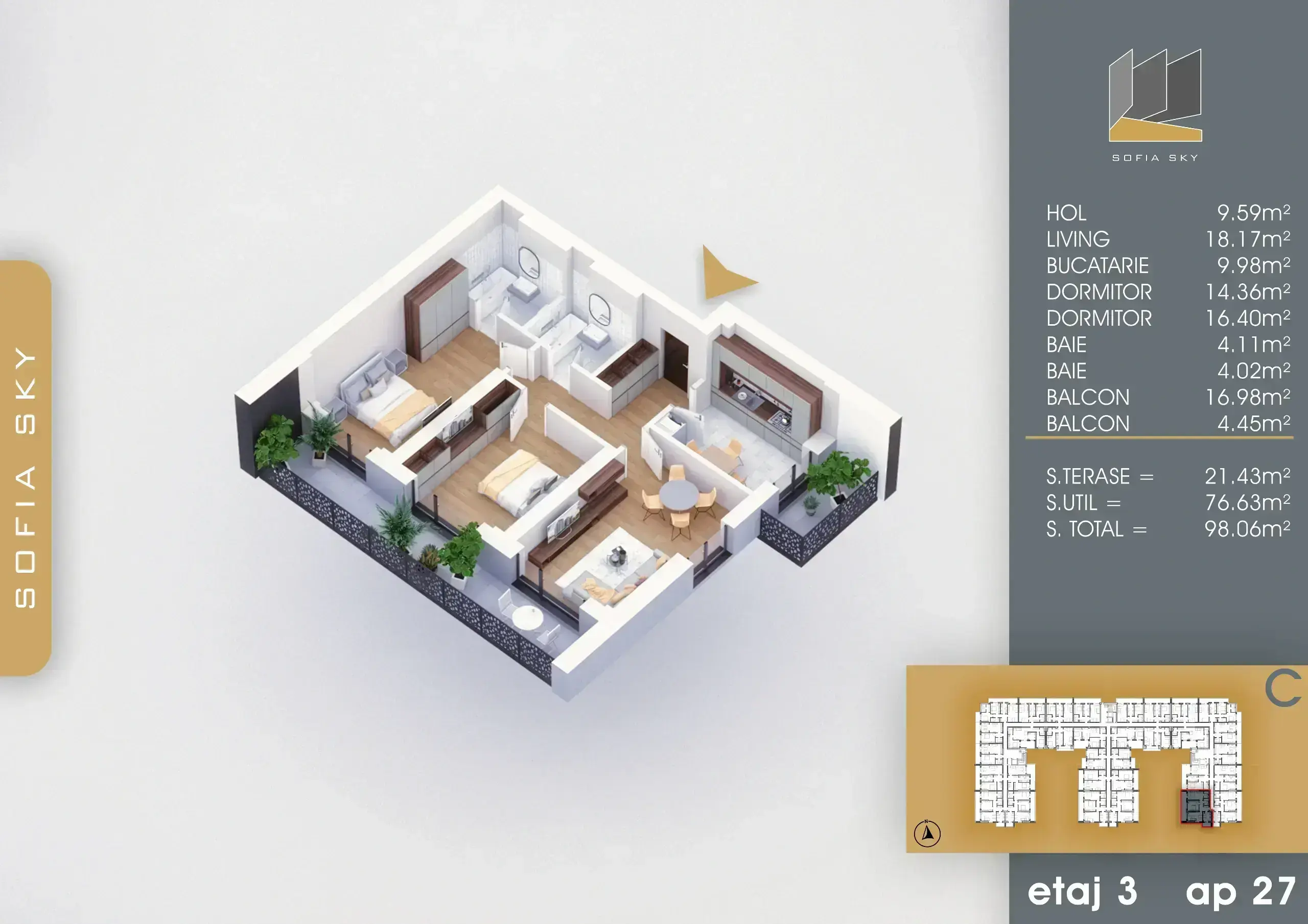 Apartament de vanzare decomandat 76.63mp utili + balcoane 21.43mp direct de la dezvoltator .