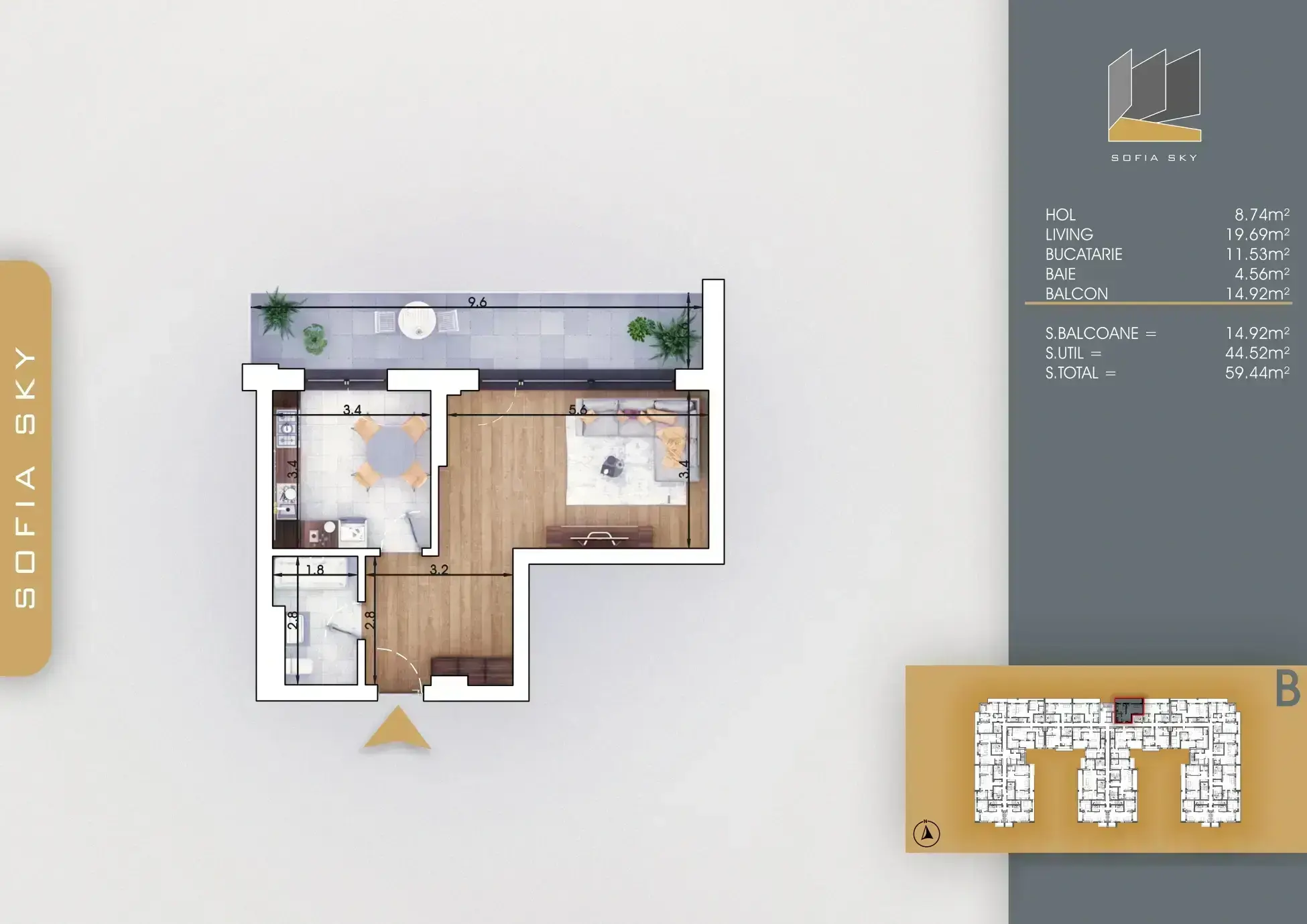 Garsonieră spațioasă de 59.44 mp utili, cu balcon generos de 14.92 mp!